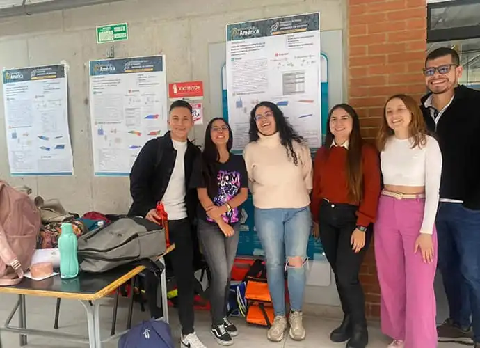 Grupo de estudiantes de la Universidad de América en un espacio colaborativo moderno.